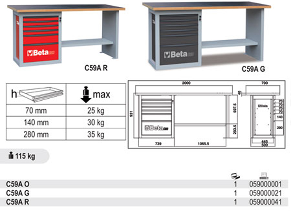 Beta C59A - 5900A Stół warsztatowy „ENDURANCE” z 1 szafką narzędziową z sześcioma szufladami