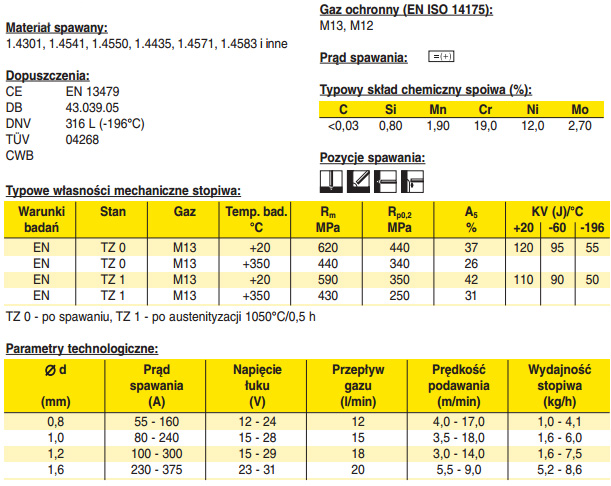 Drut austenityczny o bardzo niskiej zawartości węgla, do spawania stali odpornych na korozję, zawierających ok. 18% Cr , 12% Ni, 3% Mo oraz 18% Cr , 8% Ni. Zalecany przy narażeniu na korozję ogólną i międzykrystaliczną w środowisku kwasów i chlorków. Zwiększona zawartość Si polepsza właściwości spawalnicze. Używany w konstrukcjach przemysłu chemicznego, spożywczego, stoczniowego oraz do elementów architektonicznych.