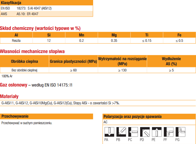 Aluminiowy pręt gatunku 4047 (W. Nr 3.2585) do spawania metodą TIG stopów aluminium Al-Si serii 4000 o zawartości