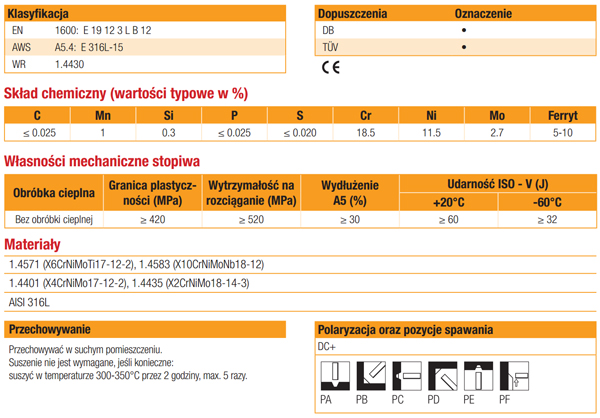 Elektroda BASINOX 316L jest zalecana do spawania elementów grubościennych w większości pozycji spawania w tym również przymusowych.