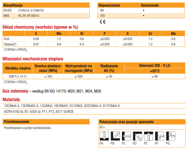 Miedziowany drut lity gatunku G CrMo1Si / ER 80S-G do spawania metodą MAG stali o zawartości C-1,25Cr0,5Mo oraz o zbliżonym składzie chemicznym, pracujących w podwyższonych temperaturach, odpornych na pełzanie, żarowytrzymałych, których temperatura pracy nie przekracza 550°C.