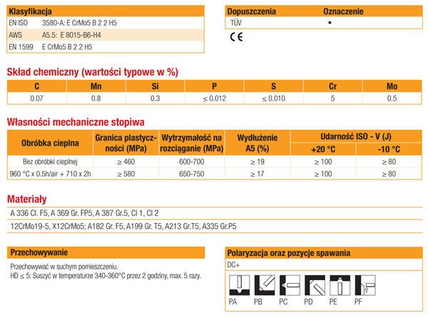 CROMOCORD 5 jest niskowodorową, zasadową elektrodą otuloną, do spawania stali pracujących w podwyższonych temperaturach zawierających 5%Cr - 0.5%Mo.