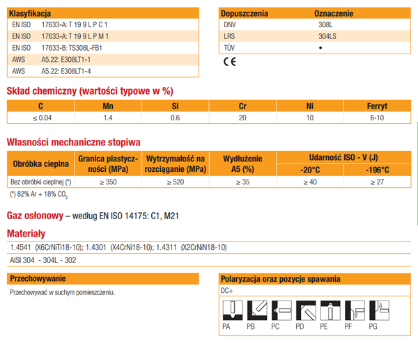 Miedziowany, rutylowy drut proszkowy do spawania austenitycznych stabilizowanych i niestabilizowanych stali nierdzewnych Cr-Ni, np. gatunku 304, 304L.
