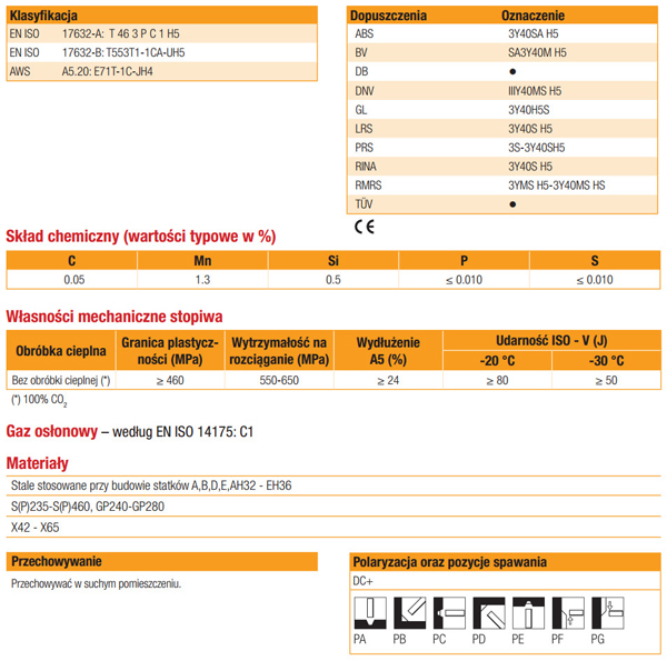 Miedziowany, bezszwowy, rutylowy drut proszkowy o zwiększonym współczynniku wypełnienia, przeznaczony do spawania niestopowych i niskostopowych stali konstrukcyjnych pracujących w zakresie temperatur od -30°C do +450°C.