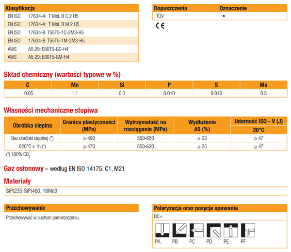Miedziowany, bezszwowy, zasadowy drut proszkowy przeznaczony do spawania stali żarowytrzymałych, niskostopowych, do pracy w podwyższonych temperaturach w przemyśle energetycznym, chemicznym i petrochemicznym, w aplikacjach wymagających odporności na pełzanie (żarowytrzymałości) do temperatury 530 °C.