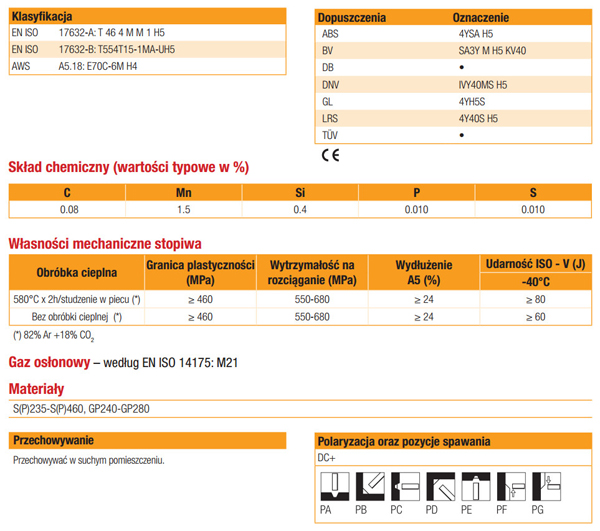 - Charakteryzuje się wysokim uzyskiem i dużą wydajnością stapiania, umożliwiając szybkie spawanie konstrukcji stalowych, dobrze nadaje się do spawania warstw graniowych i spawania w pozycjach przymusowych – przy spawaniu łukiem natryskowym, zapewnia gładkie lico o niewielkiej i regularnej łusce, brak podtopień, nawet przy spawaniu delikatnie zanieczyszczonych lub skorodowanych łączonych elementów.