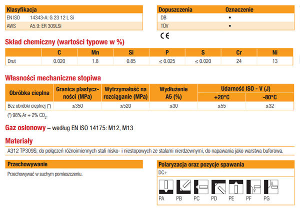 - Jako gaz osłonowy należy stosować mieszanki na bazie argonu: Ar+2%O2 lub Ar+0.5…5%CO2. Stopiwo jest odporne na pękanie gorące dzięki obecności w strukturze spoiny ferrytu delta w ilości ~12%.