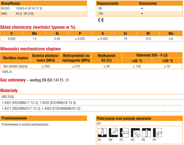 Pręt gatunku G 19 12 3 L / ER 316L do spawania metodą TIG austenitycznych stali nierdzewnych gatunku 316 i 316L. Stopiwo wykazuje wysoką odporność na korozję wżerową i szczelinową oraz na utleniające działanie kwasów. Maksymalna temperatura pracy stopiwa to 400°C. Znajduje szerokie zastosowanie w przemyśle chemicznym, petrochemicznym i spożywczym przy spawaniu rur, rurociągów, płyt oraz przy produkcji zbiorników i innych konstrukcji ze stali nierdzewnych.