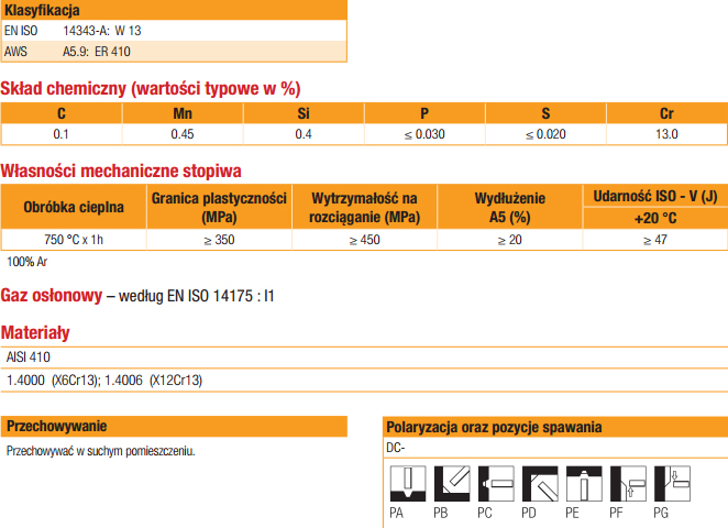 Pręt gatunku W 13 / ER 410 do spawania metodą TIG ferrytycznych stali nierdzewnych zawierających ok. 13% chromu