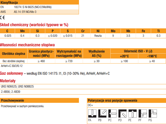 NIFIL 625 można również stosować do spawania żaroodpornych stali Cr-Ni oraz Cr-Ni-Mo, stali o dużej zawartości