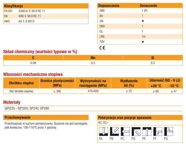 - Doskonale sprawdza się podczas spawania we wszystkich pozycjach, szczególnie w pozycji z góry na dół, może być stosowana z takimi samymi prądami spawania dla wszystkich pozycji.