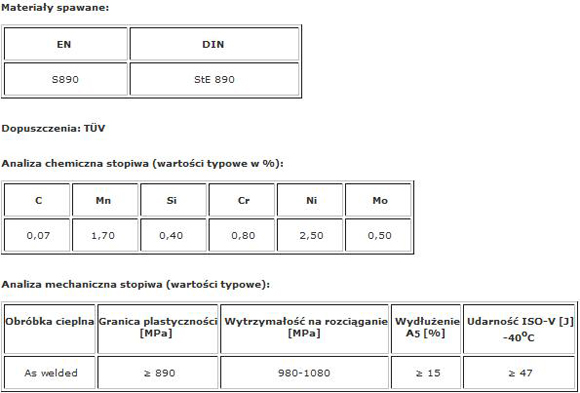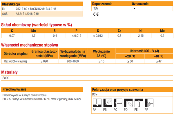 Zasadowa elektrod otulona wykonana w technologii podwójnej otuliny (do średnicy 3.2mm), przeznaczona do spawania odpowiedzialnych konstrukcji ze stali drobnoziarnistych o granicy plastyczności 890 MPa i pracujących w niskich temperaturach. Stopiwo charakteryzuje się wysoką odpornością na pękanie i wysoką udarnością ISO-V aż do -40°C. Dużą czystość metalurgiczną stopiwa potwierdzają wyniki badań rentgenowskich (RT). Dzięki podwójnej otulinie łuk jest stabilny, skupiony i ukierunkowany, czyniąc elektrodę TENACITO 100 szczególnie przydatną przy spawaniu w pozycjach przymusowych. Bardzo niska zawartość wodoru dyfundującego (HD ≤5ml/100g stopiwa).