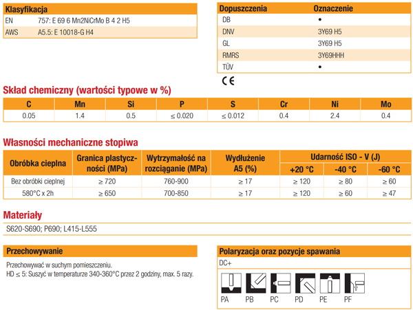Zasadowa elektroda otulana wykonana w technologii podwójnej otuliny (do średnicy 3,2mm), przeznaczona do spawania odpowiedzialnych konstrukcji ze stali drobnoziarnistych o granicy plastyczności 700 MPa i pracujących w niskich temperaturach. Stopiwo charakteryzuje się wysoką odpornością na pękanie, odpornością na starzenie i wysoką udarnością ISO-V aż do -60°C. Dużą czystość metalurgiczną stopiwa potwierdzają wyniki badań rentgenowskich (RT). Dzięki podwójnej otulinie łuk jest stabilny, skupiony i ukierunkowany, czyniąc elektrodę TENACITO 75 szczególnie przydatną przy spawaniu w pozycjach przymusowych. Bardzo niska zawartość wodoru dyfundującego (HD ≤5ml/100g stopiwa).