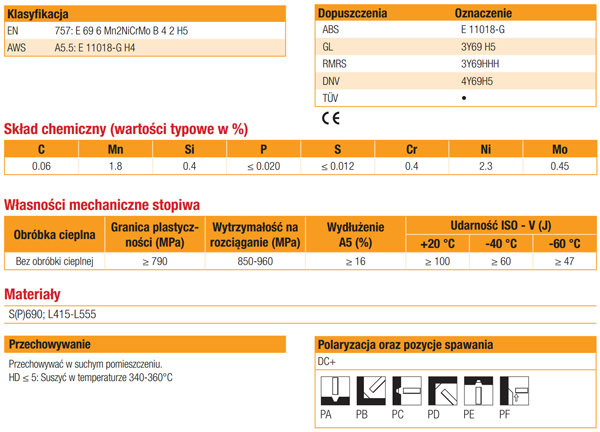 Zasadowa elektroda otulowa wykonana w technologii podwójnej otuliny (do średnicy 3.2mm), przeznaczona do spawania odpowiedzialnych konstrukcji ze stali drobnoziarnistych o granicy plastyczności 700 MPa i pracujących w niskich temperaturach. Stopiwo charakteryzuje się wysoką odpornością na pękanie, odpornością na starzenie i wysoką udarnością ISO-V aż do -60°C. Dużą czystość metalurgiczną stopiwa potwierdzają wyniki badań rentgenowskich (RT). Dzięki podwójnej otulinie, łuk jest stabilny, skupiony i ukierunkowany, czyniąc elektrodę TENACITO 80 szczególnie przydatną przy spawaniu w pozycjach przymusowych. Bardzo niska zawartość wodoru dyfundującego (HD ≤5ml/100g stopiwa).