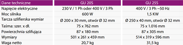- Długość – szerokość taśmy szlifierskiej 75 x 762 mm (GU 20S/240V, GU 20S/400V), 75 x 1016 mm (GU 25S/400V)